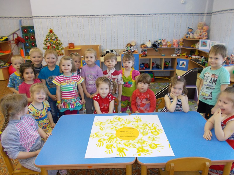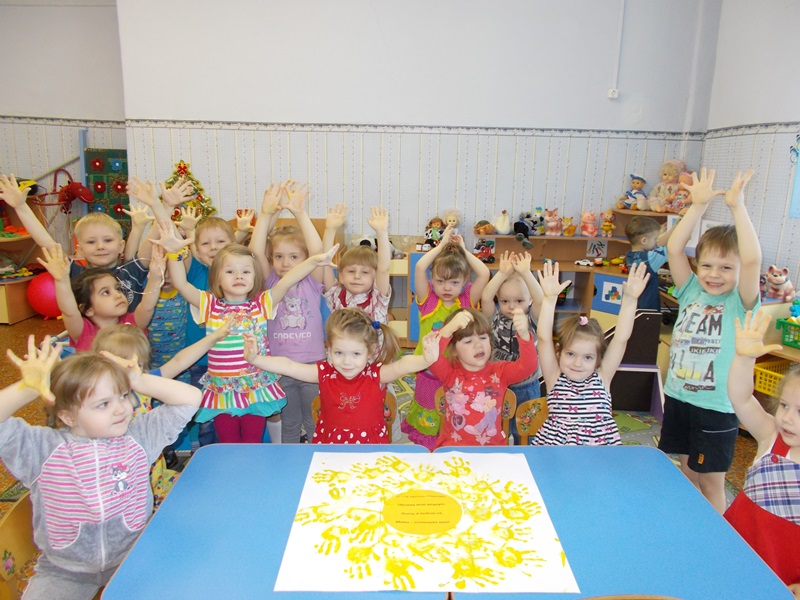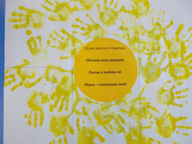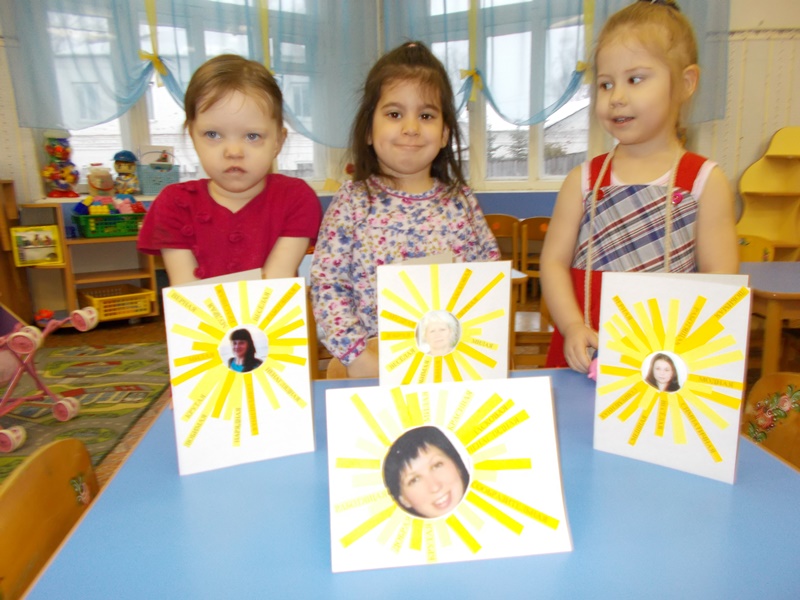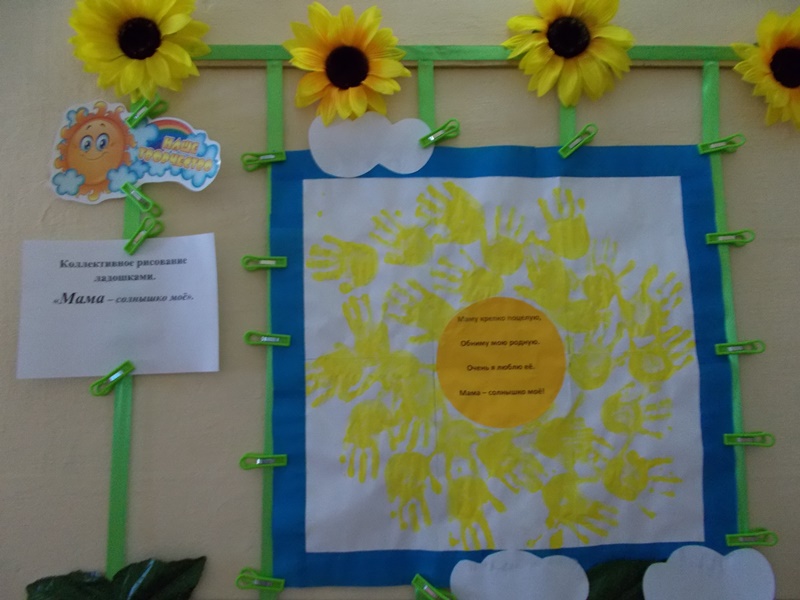 Дорогие мамы! Вот такие замечательные подарки для Вас сделали своими руками Ваши дети, воспитанники младшей группы "Мишутка". Дети очень старательно наклеивали лучики для солнышка на праздничную открытку маме. А ещё малыши с помощью "солнечных ладошек" сделали большую коллективную работу, которую назвали "Солнышко для мамочки". Получилось очень трогательно и красиво! Вы согласны?!