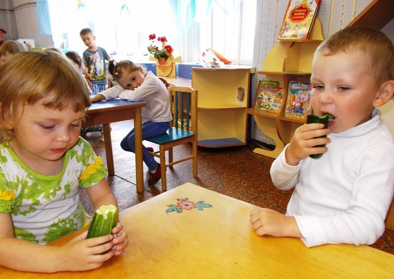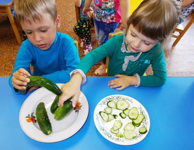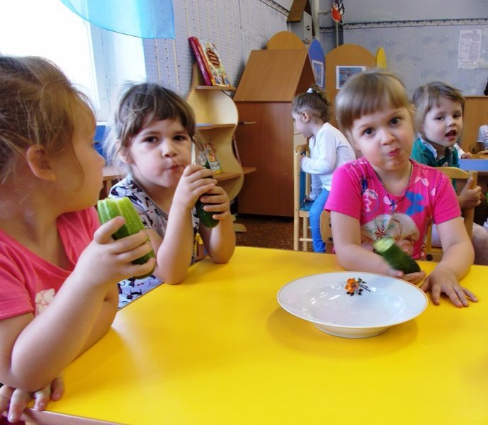 Вместе с воспитателем малыши беседовали на тему «Огуречная грядка», вспомнили потешку «Огуречик, огуречик…», сравнивали огурцы по длине и толщине и, конечно, пробовали их на вкус.