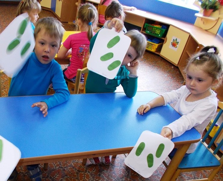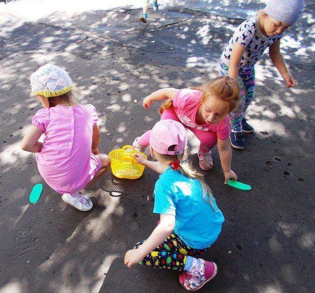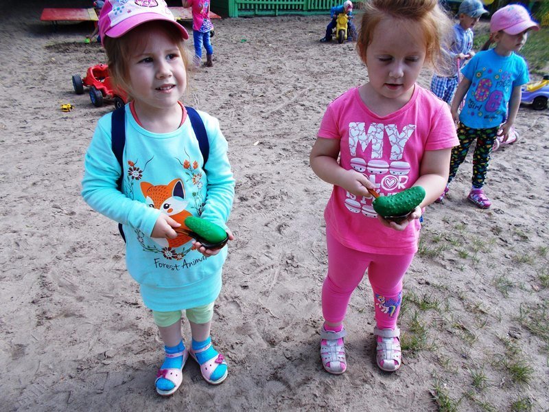 Затем из цветной бумаги делали аппликацию «Засолим огурцы в банках», сходили на наш огород, где пропололи и полили огурцы, играли в игры: «Найди огурец», «Отгадай на вкус», «Собери огуречики в корзинку».