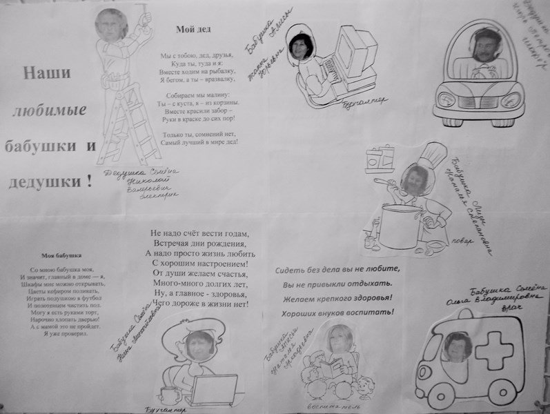 В нашей группе мы стараемся прививать детям любовь и заботливое отношение к бабушкам и дедушкам. А чтобы лучше узнать об их жизни, мы изготовили стенгазету о профессиях наших бабушек и дедушек. Ведь они ещё такие молодые, полны сил и энергии.
