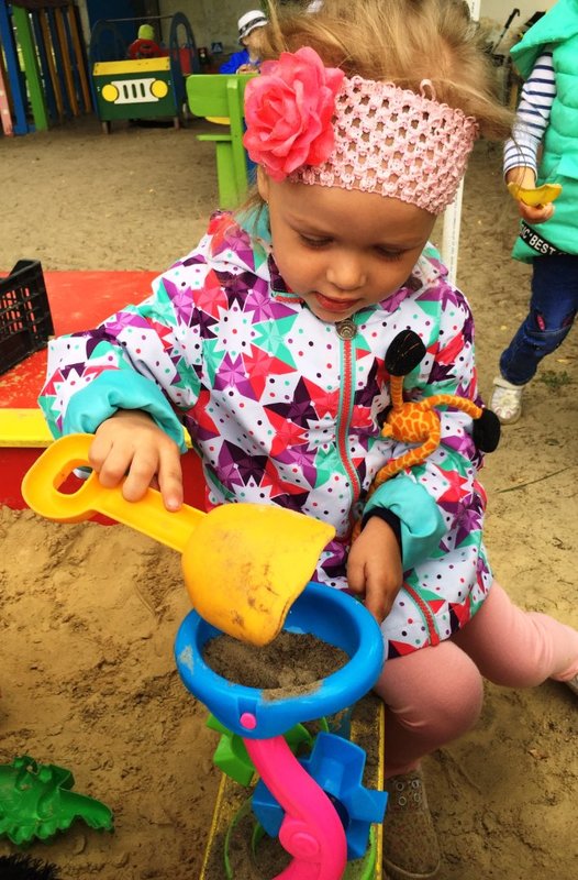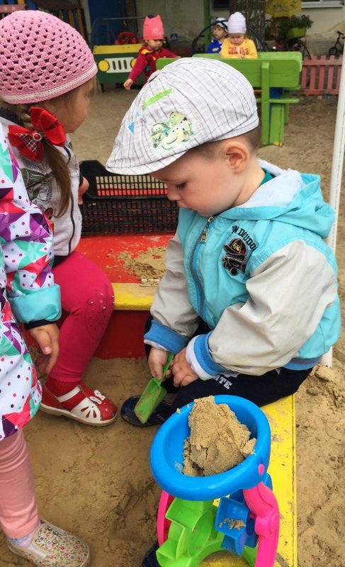 На прогулке мы знакомимся с детьми со свойствами сухого и влажного песка. Учимся способам обследования (сжать песок в руке и ссыпать с ладони). Развиваем мелкую моторику рук, координацию движений. Узнаем, что сухой песок сыпется и из него не получаются куличики, но зато крутится мельница. А из мокрого песка можно построить красивые фигурки и башни.