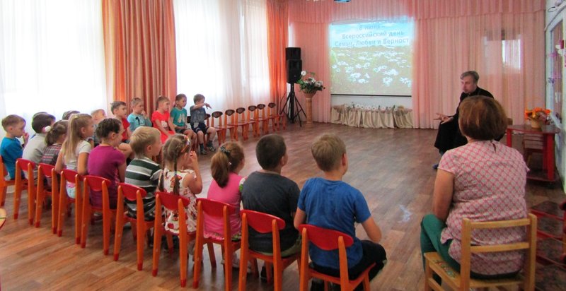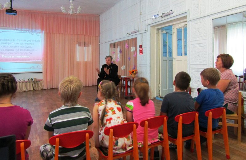 Заключительным мероприятием стала встреча с протоиреем Сретенской церкви, отцом Дионисием, которого наши ребята уже успели полюбить. А после душевной беседы все с удовольствием посмотрели детский мультипликационный фильм о Петре и Февронии, в честь которых и учрежден Всероссийский праздник семьи, любви и верности.