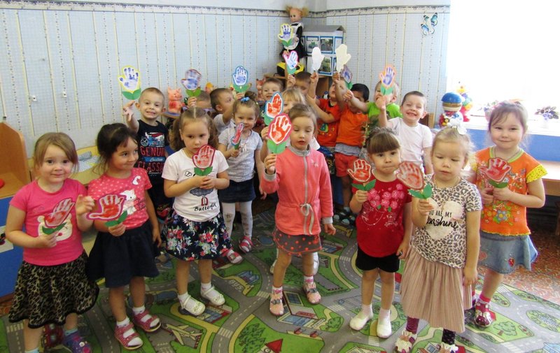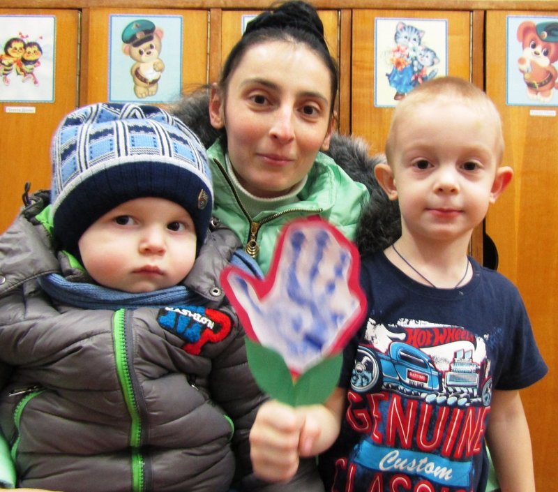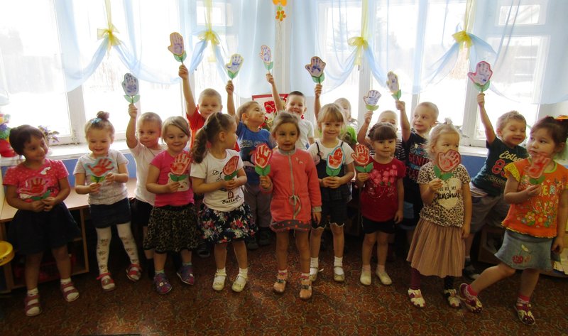 Малыши из второй младшей группы «Мишутка» (воспитатель Е.Ю.Кожокина) подарили один большой разноцветный букет для всех мам и каждой - отдельно.