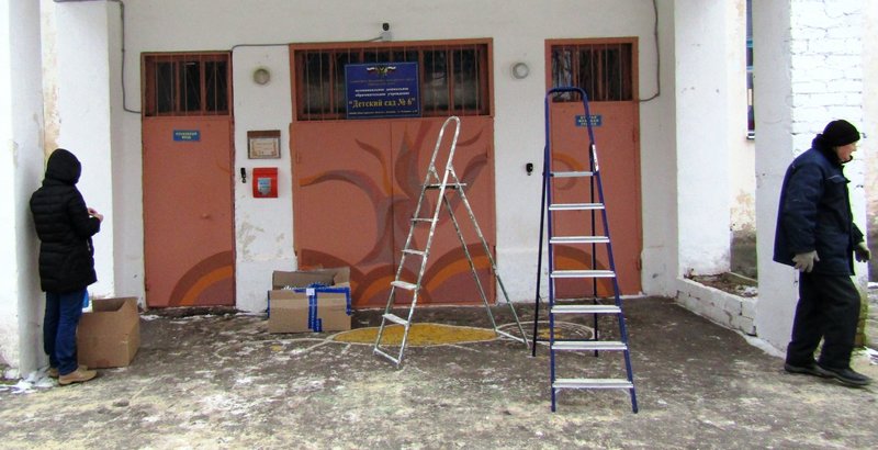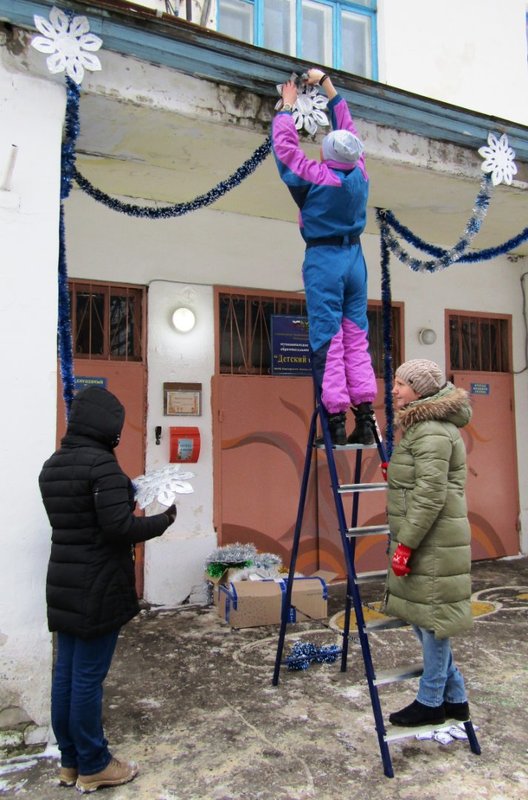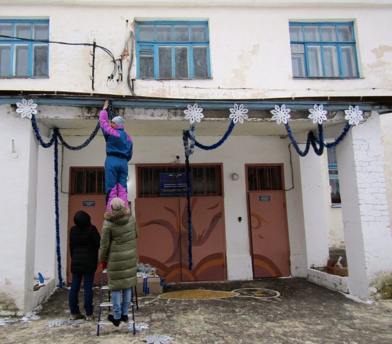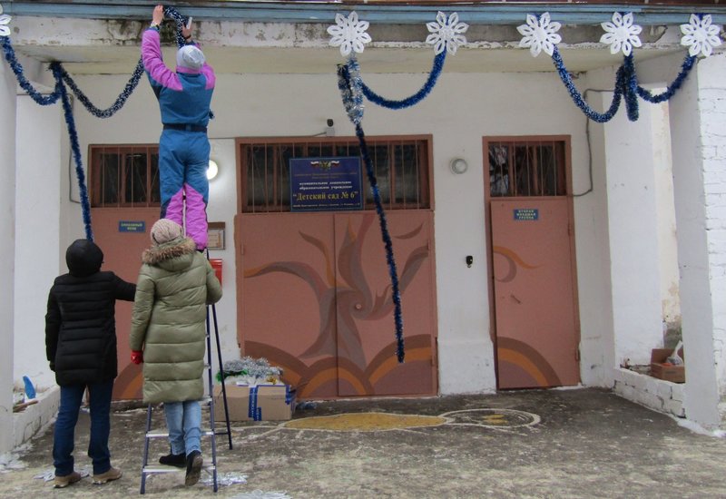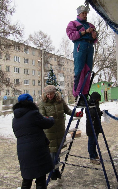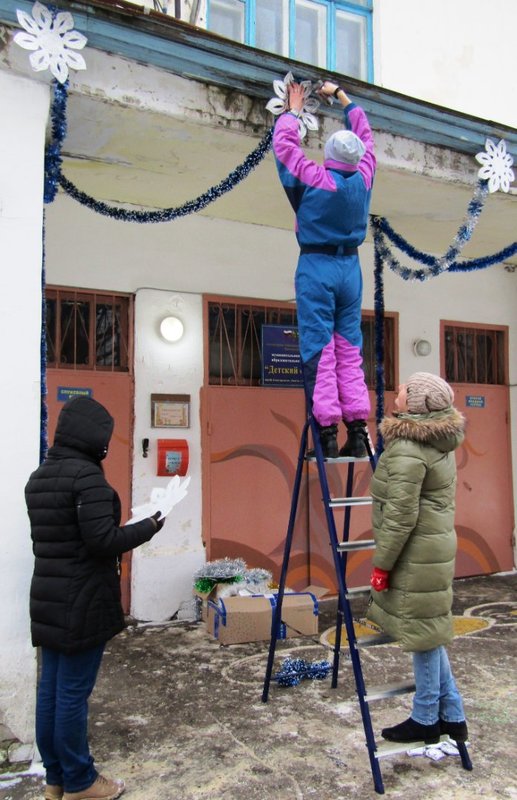 Пятого декабря мы оформляли центральный вход в детский сад и устанавливали нашу уличную новогоднюю ёлочку. В этом "волшебстве" участвовали музыкальный руководитель Ольга Владимировна Тимчишина, дворник Игорь Петрович Борисов, практикантка Лидия Ремизова и родители наших воспитанников: Дарья Михайловна Багаева и Нина Сергеевна Латышева.