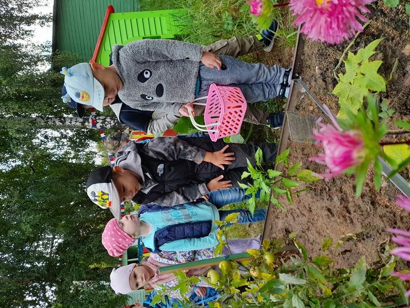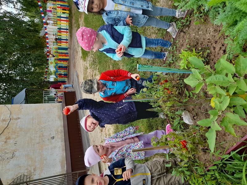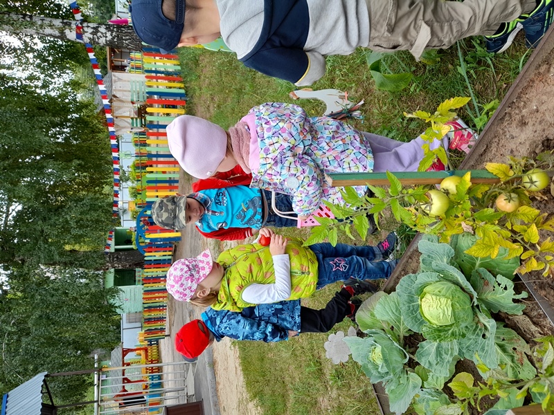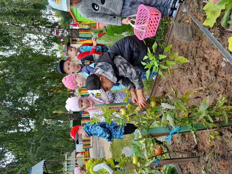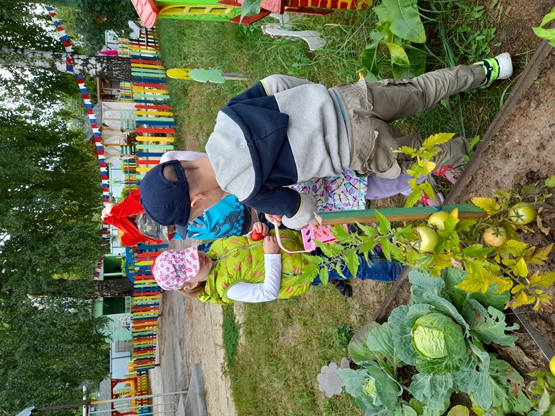 Ранее собирали редис и кабачки, перец и огурцы. Настало время помидоров… Весело и интересно, когда видишь, как из маленькой рассады вырастают настоящие помидоры! Не в магазине с мамой купленные, а выращенные на детсадовском огороде! Такое запоминается надолго!