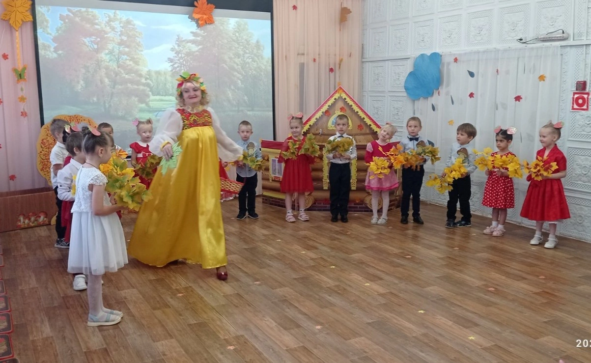 В гости к ним приходила "Золотая Осень" и принесла с собой в корзинке ягодки и грибочки, которые показали как они умеют читать стихи, отгадывать загадки, исполнять песни и зажигательно танцевать.
